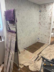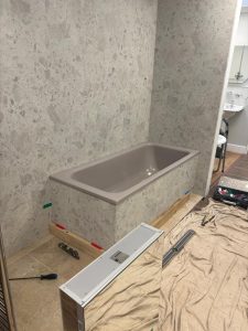 The Nuance Light Terrazzo wall panels bring a beautifully soft roche texture to the space, perfectly complemented by coordinating tiles for a clean, cohesive look. The neutral tones pair effortlessly with the taupe bath, sleek brassware and minimalist fittings, creating a bathroom that feels both modern, and timeless.